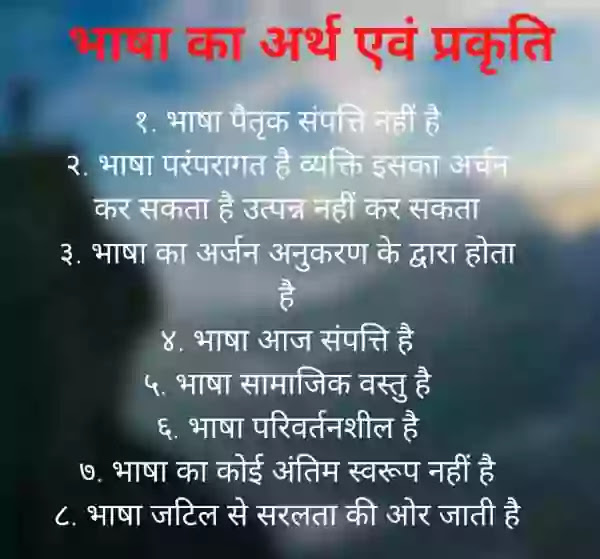 ६. भाषा परिवर्तनशील है :- वस्तुतः भाषा के मौखिक रूप को ही भाषा कहा जाता है लिखित रूप तो इसलिए पीछे पीछे चलती हैं भाषा को व्यक्ति अनुकरण के द्वारा सीखता है और या अनुकरण सदा पूर्ण होता है इसी कारण भाषा में हमेशा बदलाव या परिवर्तन होता है।