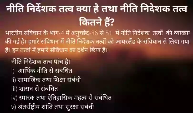 आज हमने इस पोस्ट के माध्यम से नीति निर्देशक तत्व क्या है, नीति निदेशक तत्व कितने हैं, नीति निर्देशक तत्व किस देश से लिया गया है, नीति निदेशक तत्व का क्या उद्देश्य है के विषय में पढ़ा। दोस्तों अगर आपको यह पोस्ट अच्छा लगा तो इसे शेयर करें और कुछ सुझाव हो तो कमेंट के माध्यम से बताएं।