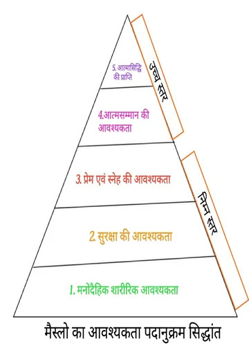 मैस्लो ने शारीरिक एवं दैहिक अभिप्रेरणा, सुरक्षा की आवश्यकता एवं संबंध, स्नेह की आवश्यकता इन सभी आवश्यकताओं को निम्न स्तर में रखा है तथा सम्मान की आवश्यकता एवं आत्मासिद्धि की आवश्यकता को उच्च स्तर में रखा हैं साथ ही मैस्लो ने कहा कि जब तक मानव का एक स्तर की आवश्यकता की पूर्ति नहीं हो जाती वह दूसरे आवश्यकता या स्तर पर कदम नहीं रखता है यह सभी क्रमबद्ध या पदानुक्रम चलता है।