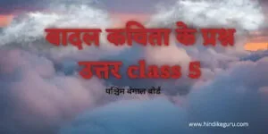 आप सभी का इस आर्टिकल में मैं स्वागत करता हूं। आज हम इस आर्टिकल के माध्यम से बादल कविता के प्रश्न उत्तर class 5 को पढ़ने जा रहे हैं जो पश्चिम बंगाल बोर्ड के सरकारी विद्यालय से लिया गया है जिसमें बच्चों को बादल के बारे में बताया जा रहा है कि बादल कितने रंगों के होते हैं?, कैसे बनते हैं?, तथा किस प्रकार से बादल धरती की सेवा करता है? तथा बादल कविता से हमें क्या प्रेरणा मिलती है के बारे में बताया गया है तो आये बिना किसी देरी के बादल कविता के प्रश्न उत्तर class 5(badal kavita question answer class 5)के बारे में पढ़ें।
